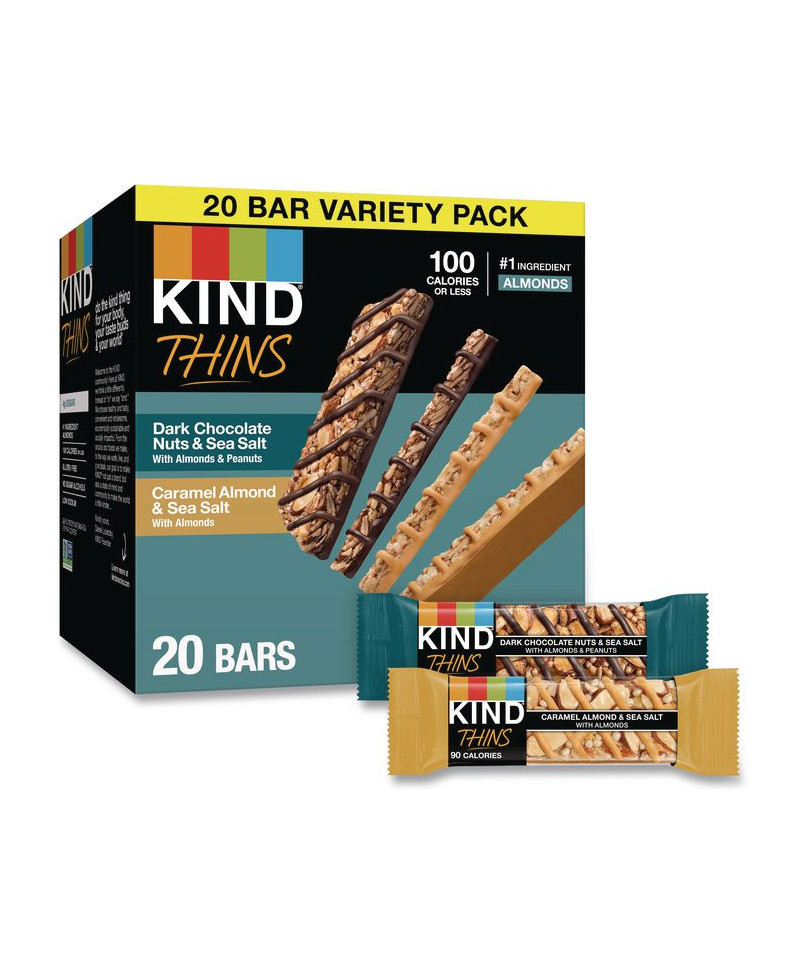 With almonds as the #1 ingredient, these gluten-free bars feature a thin layer of sliced almonds and diced peanuts. These snack bars contain four grams of sugar and 90 calories per serving. Choose between Dark Chocolate Nuts & Sea Salt or Caramel Almond & Sea Salt flavors, but in a portion-controlled bar. These crunchy thin granola bars are great for any occasion.