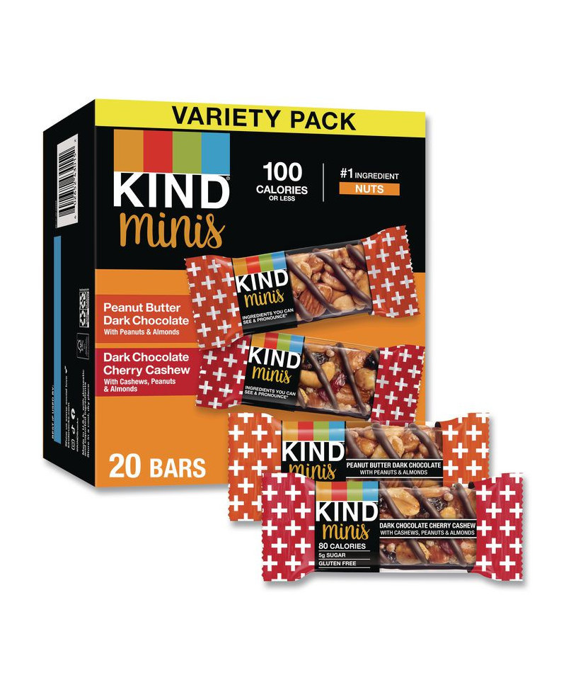 Choose between Peanut Butter Dark Chocolate or Dark Chocolate Cherry Cashew flavors, but in a portion-controlled treat format. Reach for this healthy snack bar when you just need a bite-sized snack or an afternoon pick-me-up. Each KIND Dark Chocolate Cherry Cashew Mini contains 80 calories and has a low glycemic index. Each KIND Peanut Butter Dark Chocolate Mini contains 100 calories and 3 grams of protein. KIND Minis bars are also gluten-free, low sodium snacks that are made without genetically engineered ingredients.