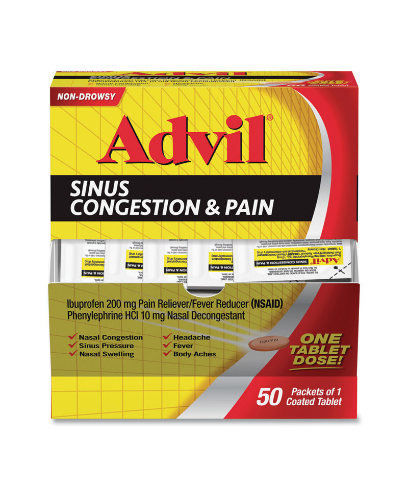 Combines the speed and strength of Advil and a proven nasal decongestant for fast, effective relief of sinus pressure and congestion associated with colds. Re-open your airways by constricting the blood vessels in your nose and sinuses and treat the pain associated with colds. Packaged for individual use for on the go or to replenish first aid stations and kits.