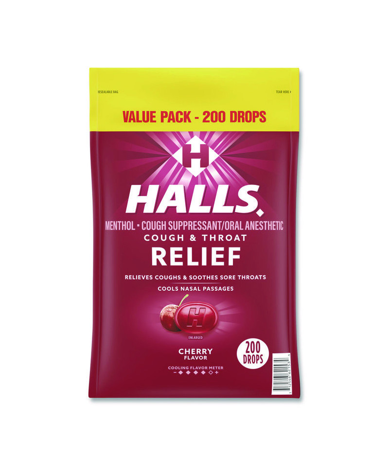 Halls Relief Cough Drops are ready for whatever life throws, or coughs, your way. With 5.8 mg of menthol per drop, these Halls cough drops relieve coughs, soothe sore throats and cool nasal passages to relieve your worst symptoms. This value size pack of cough suppressant drops come in a tasty flavor that is both refreshing and soothing. Whether you're using Halls cough drops for sore throat relief, cough relief or as an oral anesthetic, simply dissolve one drop in your mouth slowly, and repeat every two hours as needed. Once the drop starts to dissolve, it usually starts working quickly. The advanced formula and triple soothing action get you back on your feet so that you can do the things you need to do. Halls Relief menthol cough drops are formulated for adults and children five years and older. Each bag contains 200 menthol cough drops, giving you enough to stock your home or office during cold and flu season. The bags are resealable to keep the cough drops fresh and effective. The resealable packaging also makes it easy to toss into your bag, travel pack or desk drawer, giving you convenient access when symptoms strike.