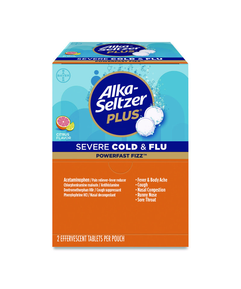 The Alka-Seltzer Plus Power Fast Fizz severe cold and flu citrus effervescent tablet dissolves quickly in hydrating water and is instantly ready to start working. Each dose is individually wrapped and transforms in just 4 oz of water into a liquid-fast medicine. After you drink the refreshing, sparkling solution, Alka-Seltzer Plus Power Fast Fizz works quickly to relieve your worst cold symptoms such as nasal and sinus congestion, cough, sneezing, fever, runny nose, headache, sore throat, body aches, and pains.