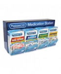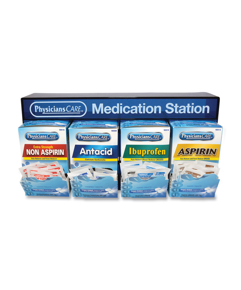 Convenient kit provides quick access to four of the most frequently used medications: ibuprofen, a non-aspirin pain reliever, aspirin and antacids. Handy medication station is an innovative and easy solution for dispensing common medications at the office. Medication boxes are individually replaceable. Includes a unique, easy-to-install grid system. Ideal for use in common areas, like as office kitchens and breakrooms.