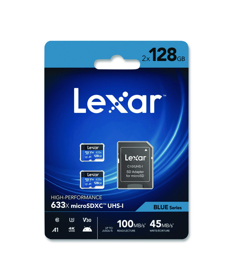 Designed for your smartphone, tablet, or action camera, the Lexar™ High-Performance BLUE Series microSDXC UHS-I card lets you quickly capture, playback, and transfer 1080p Full HD, 3D, and 4K UHD video, as well as the highest-quality movies, photos, and songs. This high-capacity, Class 10 card leverages UHS-I technology to deliver read speeds up to 100 MB/s. This memory solution includes an SD adapter and provides the speed and space you need to capture more adventure on the go.