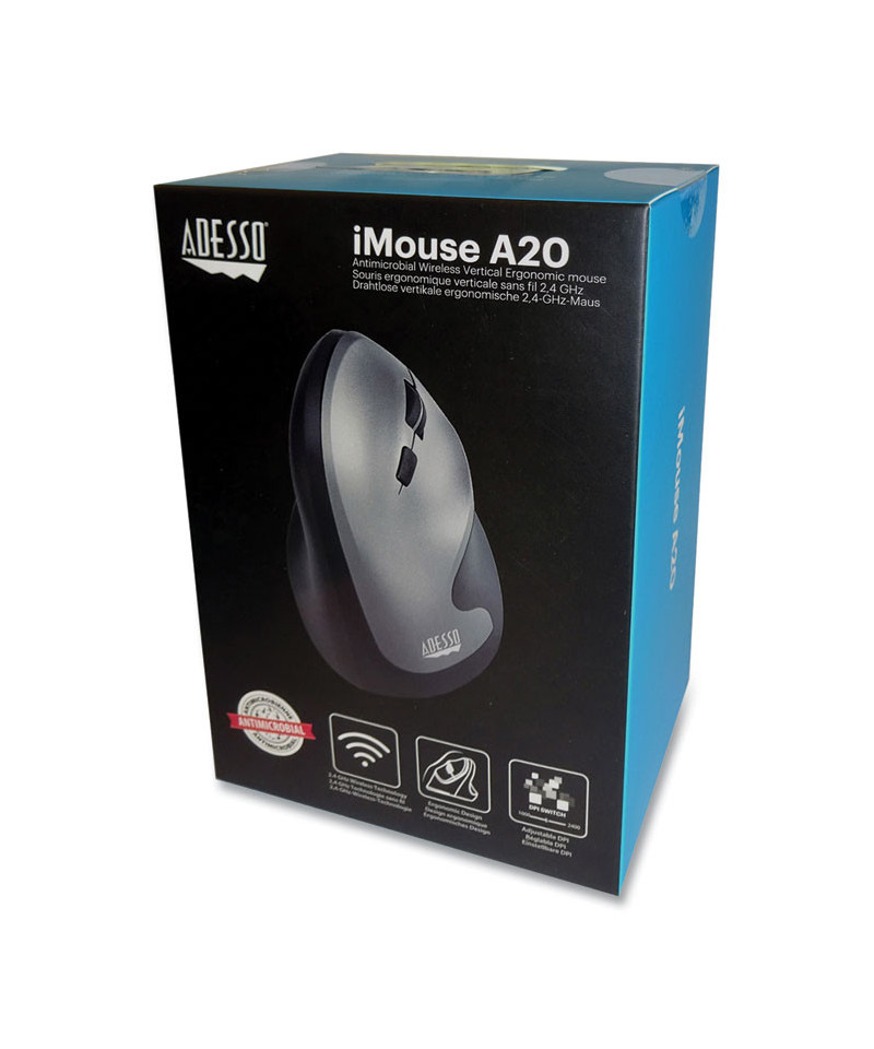 This wireless mouse is specially designed with a vertical shape which provides a uniquely comfortable ergonomic mouse experience. Antimicrobial coating resists germs and bacteria on the mouse surface. Buttons are conveniently located on the side allowing for intuitive control and faster back and forward browsing. The switchable dpi (1000/1600/2400) provides for two levels of control. Its optical sensor tracking method lets you work on most surfaces with better speed and accuracy. It includes a nano receiver to offer you up to 33 ft of wireless freedom and eliminates the constraints that wired mice often cause. The iMouse A20 is plug and play and requires no drivers.