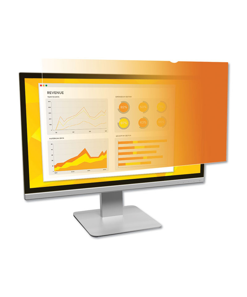 3M™ Gold Privacy Filters project a vibrant gold shield to prying eyes from the side, while you get incredible clarity so your confidential information is visible only to you. 3M™ Gold Privacy Filters fade to black starting at the 30-degree side angle, are great for high-resolution laptops and monitors, are reversible to black glossy and reduce 35% of blue light transmission.