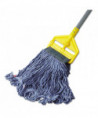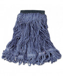 The Rubbermaid Commercial Swinger Loop Wet Mop is a looped-end, tailbanded mop that features a blend of post-industrial cotton and synthetic fibers for higher absorbency and more launderings than cotton mops, and with looped ends and a woven tailband to reduce tangling and fraying for better performance. The floor mops headband is a PVC-coated mesh that resists moisture retention and chemicals. Blue cleaning equipment is recognized in the industry as color-coded for general purpose cleaning in low-risk areas as part of a zone isolation system to help minimize cross-contamination. Launderable up to 50 times.