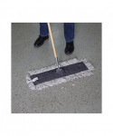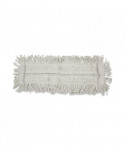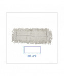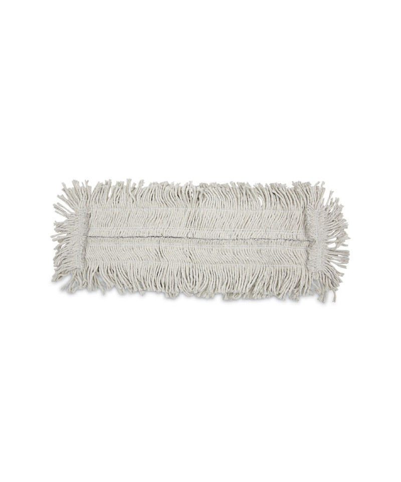 Four-ply, pretreated yarn, dust mop head. Equipped with a slot pocket backing which allows a metal dust mop frame to slide into its place quickly and easily. Sewn center fringe for added coverage and durability. The disposable head can be discarded when dirty. Ideal for use on floors that require dusting, with or without cleaning spray. Handle and frame are sold separately.