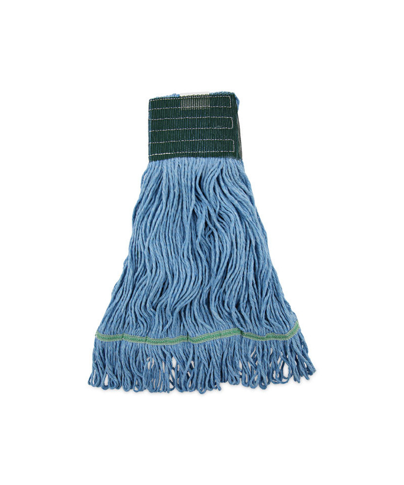Head is constructed from four-ply, premium, open-end spun cotton/rayon/synthetic blend yarn. The looped-end design which sheds less lint, reduces fraying and unraveling. The durable, double-sewn tailband prevents tangles and provides more floor coverage with each stroke. The quality mop head is held together with a sturdy, 5-inch, mesh headband. Machine washable. Mop handle sold separately.