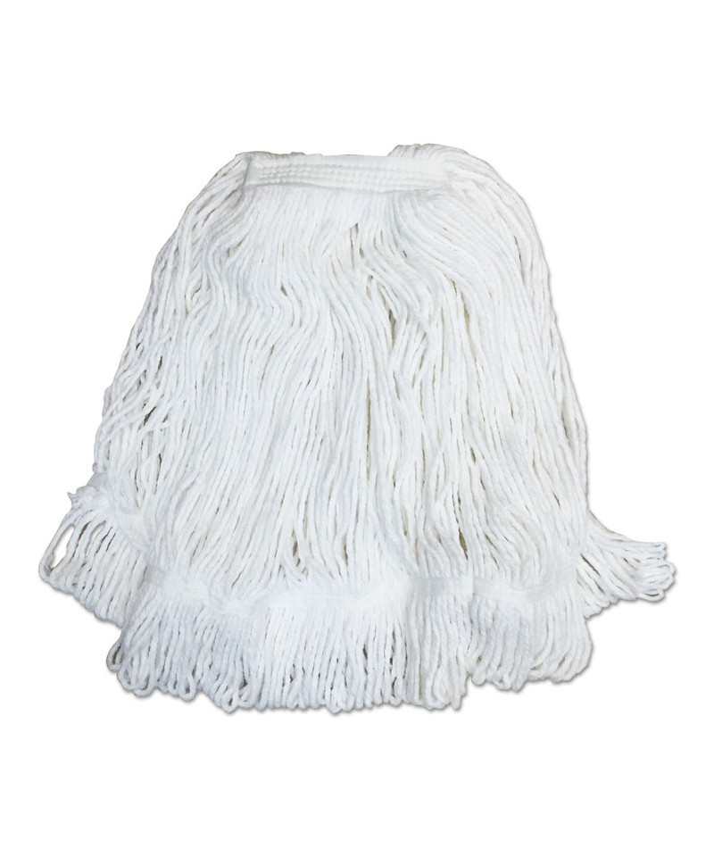 This sturdy mop head is made with premium four-ply yarn and a heavy-duty, polyester tape headband. Constructed with a looped-end design that minimizes less lint, fraying, and unraveling. Built to be durable, the double-sewn tailband prevents tangles and provides more floor coverage. Made from high-quality fiber. Great for general cleaning or floor finishing. For use with clamp style mop handles, which are sold separately.
