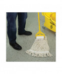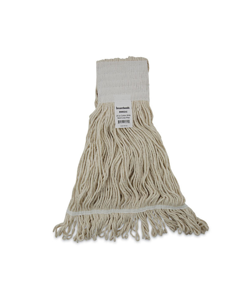 Boardwalk Saddleback Loop-End Wet Mop Heads are constructed from standard, four-ply, natural yarn for a quality mop head. The looped end design sheds less lint, reduces fraying and unraveling. The durable, double-sewn tailband prevents tangles and provides more floor coverage on a variety of floor types. The heavy-duty, five-inch, vinyl mesh headband securely holds full-weight, premium fiber strands. Designed for use with clamp-style or gripper-style mop handle, which is sold separately.