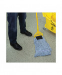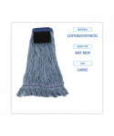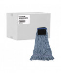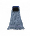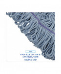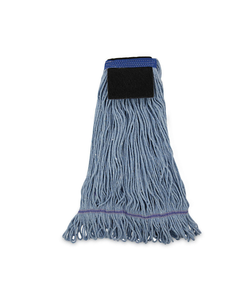 This mop with scrub pad is a good quality, economical, four-ply blend of cotton and synthetic fibers. The built-in scrubbing pad provides the highest level of abrasion, making it an excellent choice for foodservice areas. The blue yarn keeps the mop head looking newer for longer. Crafted with looped ends to reduce unraveling. Durable mop with a double-sewn tailband.
