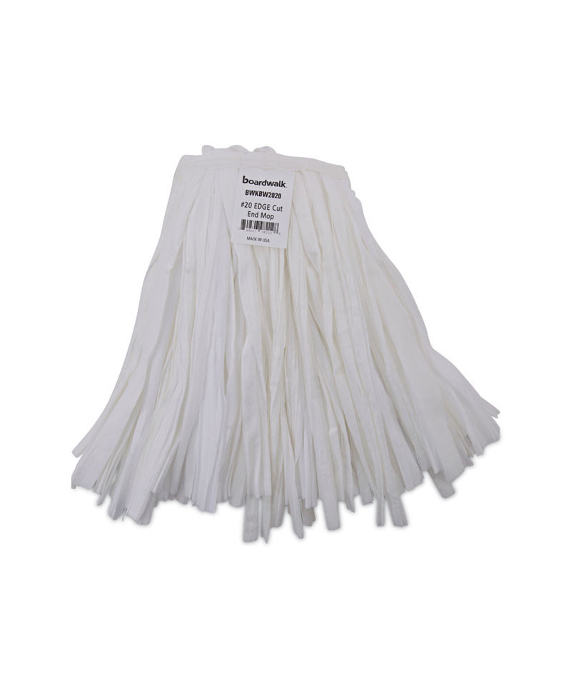 Boardwalk® Nonwoven Cut End Edge Mop is a reliable, white rayon and polyester blend fiber mop that produces less lint than traditional cotton mops. The synthetic heads provide greater absorption than cotton and are easier to wring out, with less unwanted material in waste stream. Each mop is individually packaged to preserve cleanliness and requires no break in. Handle sold separately.