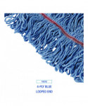 This sturdy four-ply cotton/synthetic blend mop head is launderable for repeated use. It helps cover more floor area by absorbing up to seven times its own weight in liquid. The looped ends help to reduce unraveling and linting. Its sturdy tailband is double-sewn and durable for longevity. The large headband is made from heavy-duty vinyl mesh. Made from blue cotton.