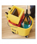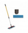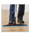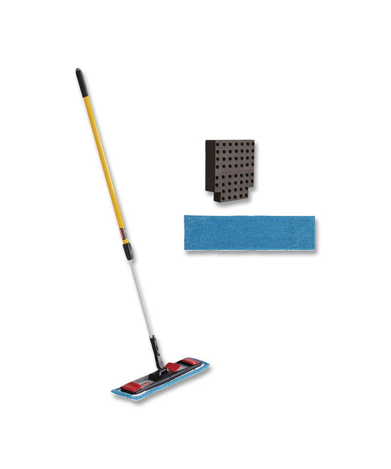The Adaptable Flat Mop system allows for ergonomic microfiber mopping with your existing Rubbermaid mop bucket. Frame does not require adjustment to alternate between two different mopping functions. Strong black tabs connect to frame via red clips to hold mop pad on during rinsing and wringing. Tab function combines powerful microfiber mopping with your trusted WaveBrake bucket. Pocket function allows for simple microfiber mopping with your spray mop handle. Secure pockets allow frame to easily slip in and out of mop pad, and hold frame in place while mopping. Mop pads are made of high-quality polyester/nylon split microfiber and can be laundered up to 200 times (100 times with bleach) and last 6X longer than Rubbermaid large cotton string mops. Microfiber pad removes 99.7% or more of tested viruses (Feline Calicivirus a surrogate for Norovirus) and bacteria (MRSA, Pseudo, C.diff) with water only to help improve cleaning efficacy. The Adaptable Flat Mop Kit includes one Adaptable Flat Mop Frame, two Adaptable Flat Mop Pads (blue), one Wringer Insert, and one Quick-Connect handle.