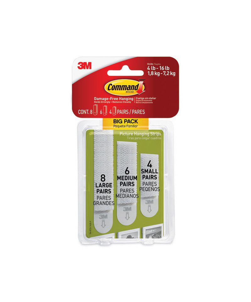 Damage-Free Hanging Picture Hanging Strip Pairs, (8) Large (3.75 lb), (6) Medium (2.5 lb), (4) Small (1.25 lb), White, 18/PK