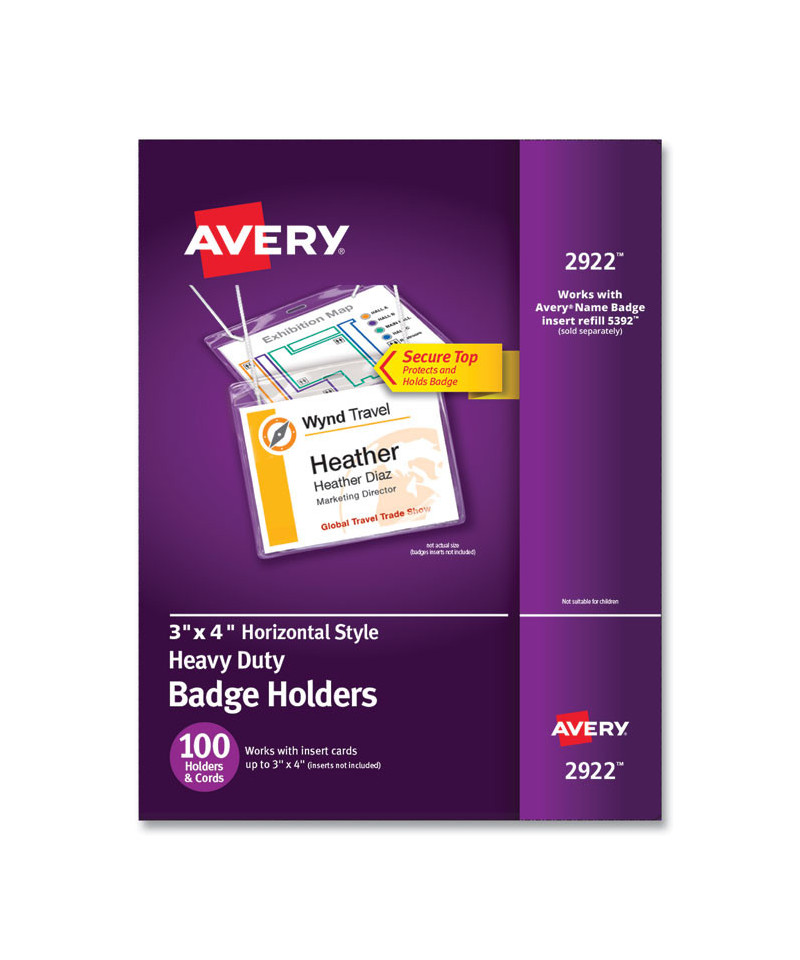 Heavyweight plastic badge holders are durable and reusable. Secure-top design keeps badge inserts from falling out. Multipurpose for lanyards, reels or clips. Customize with Avery® Name Badge Inserts (5390 and 5392) and free templates and designs using Avery Design & Print online.