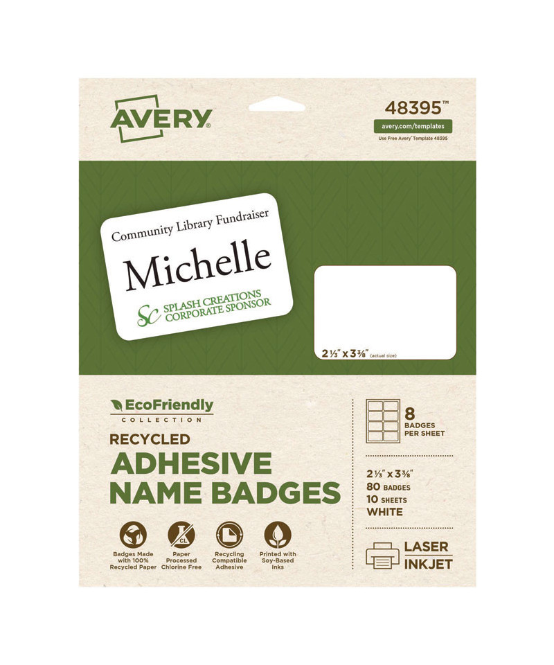 When you're meeting new faces for the first time, be smart with EcoFriendly Adhesive Name Badges—the labels that work for you. The label paper and packaging are made entirely of recycled materials. Both the product and its packaging are also processed chlorine-free to substantially reduce the harmful substances associated with the manufacturing process. After use, you can maintain your good habits, as both the label paper and packaging are completely recyclable. All pre-printed components of the product employ soy- and vegetable-based inks, which come from renewable materials. With Avery® EcoFriendly Name Badges, you can trust in the same high quality you've come to rely on from all Avery® products; and with free templates from Avery® Design & Print, you can create and customize your name tags in a snap. 8 1/2" x 11" sheets for laser and inkjet printers.