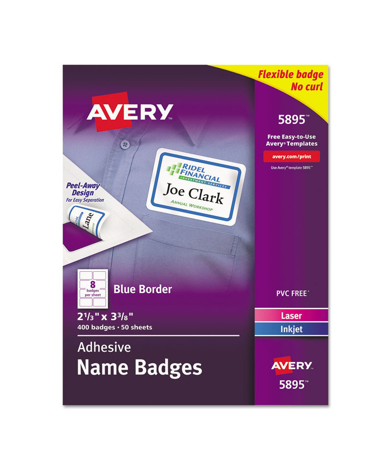 Flexible badges move with fabric, ensuring that they stick securely without curling or falling off. Peel-away design allows for quick and easy separation. Handwrite or customize with free templates and designs using Avery Design & Print. 8.5" x 11" sheets for laser and inkjet printers.