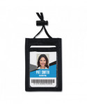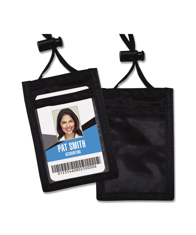 Convention pouch displays identification cards as well as offers additional storage. Back features two pockets; one open and one zippered to store credit cards or other items. Adjustable 44" cord. Black.