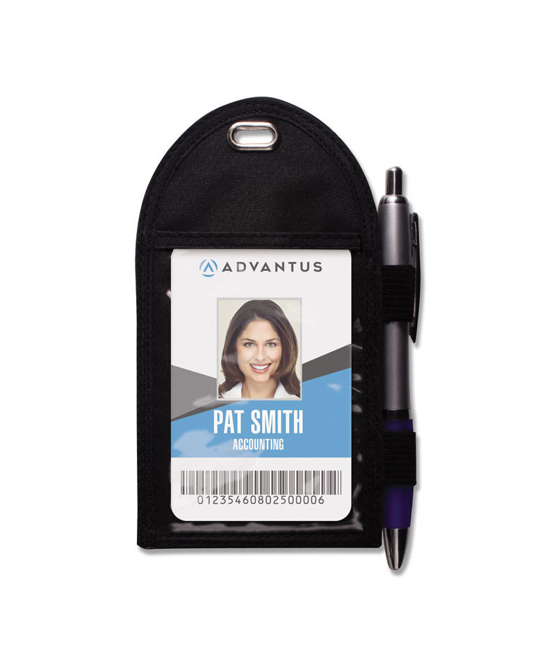 This durable badge holder includes a loop for keeping your pen handy. Metal-lined punch at the top of the holder allows for easy attachment to a lanyard or badge reel. Includes an additional hook and loop closure pocket on the back for cash, business cards, or other small items.