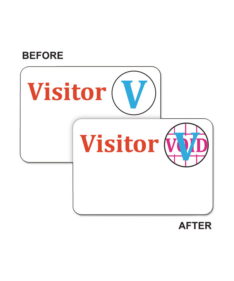 These easy to use self-expiring badges are ideal for visitor control. Highly visible color spot indicator signifies badge expiration. Identifies trespassers up to 50 ft away. Reveals a bright red VOID notice after one day. To activate, simply adhere the two parts together. Do not apply to vinyl, leather, suede, corduroy or silk. Can be customized with your logo, contact manufacturer for details. This product will be cheerfully replaced with one of equal value if defective in materials, manufacturing or packaging at the time of purchase. Except for such replacement, this product is sold without warranty or liability even though defect, damage or loss is caused by negligence or other fault.