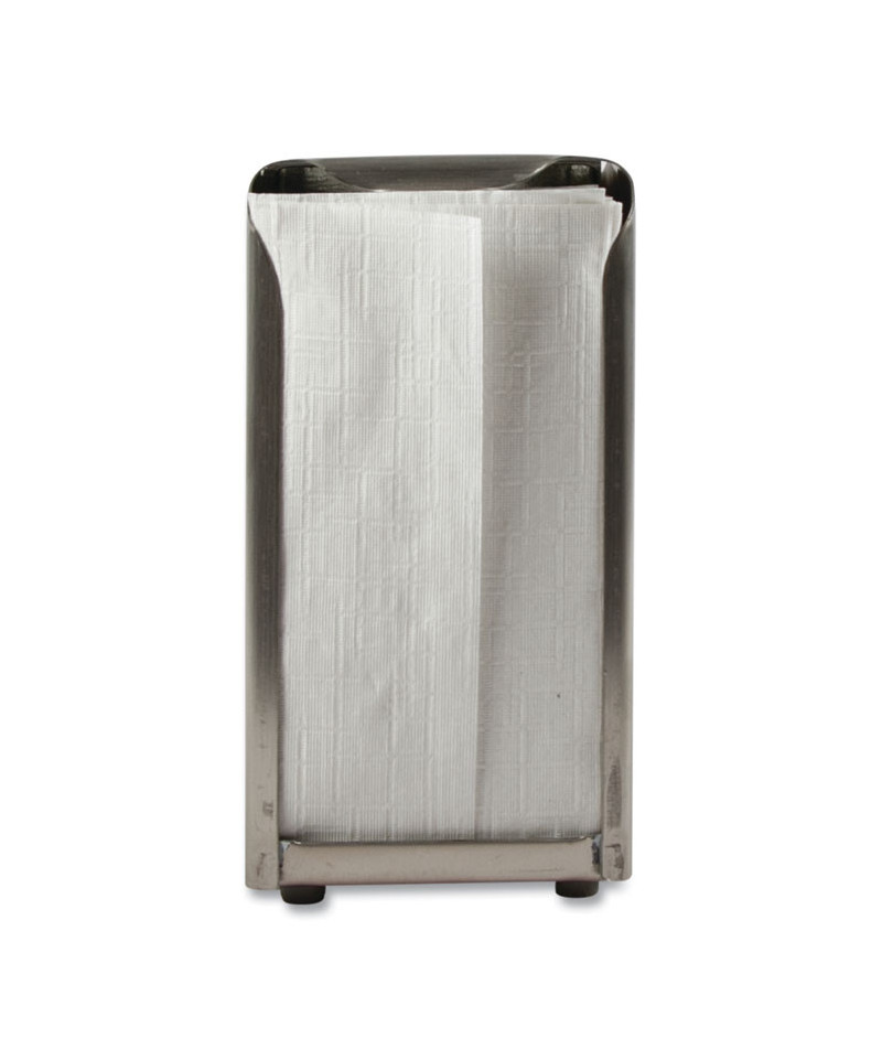Easy-loading, two-sided napkin dispenser. 22-gauge stainless steel construction. Presents a professional image to patrons and provides easy access to napkins at each table.