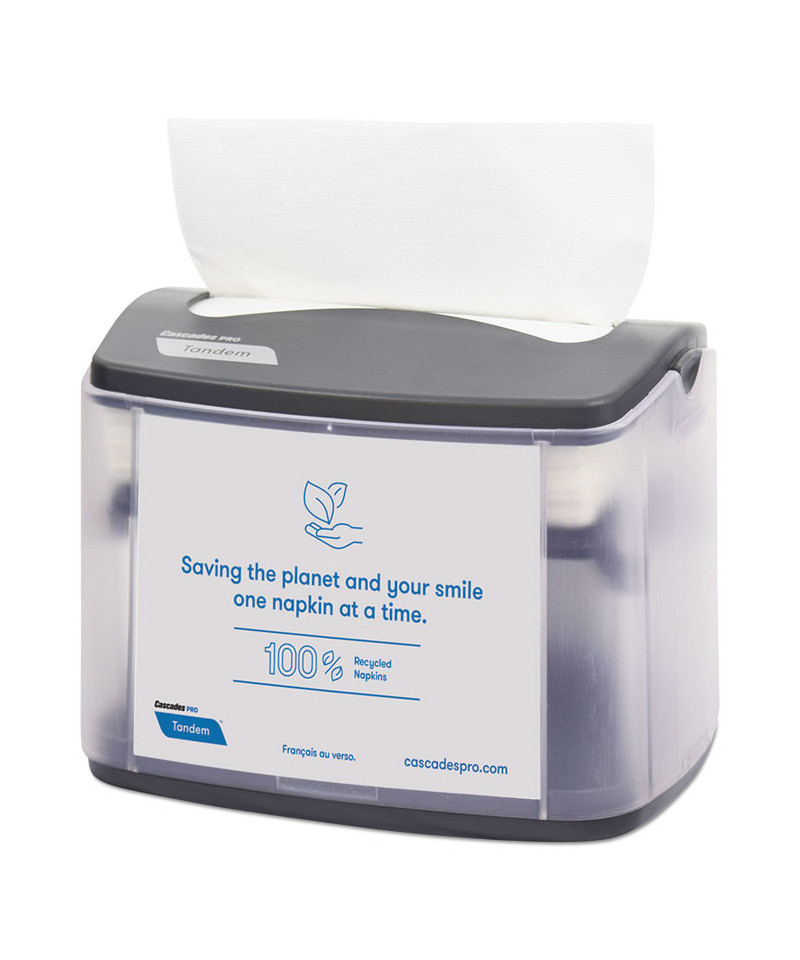 Cascades PRO Tandem™ tabletop interfold napkin dispensers are a sustainable and cost-effective solution for food service and retail establishments. The interfold napkin dispensers feature one-at-a-time napkin dispensing design and compact size that's ideal for counters, tables and concession areas. With a sleek design and translucent cover, these dispensers will fit seamlessly into any décor and make it easy to monitor napkin levels and determine when it's time to reload. These dispensers use Cascades PRO Perform™ napkins. You can use the OnDisplay™ feature to turn your dispensers into powerful marketing tools.