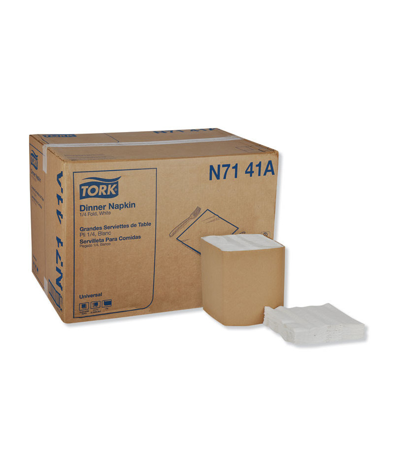 Tork Universal Dinner Napkin's single-ply embossed semi-crepe texture provides a higher-quality feel and better absorbency. An inexpensive alternative to multi-ply napkins. Napkins are always fresh and sanitary. Perfect for high-volume applications.