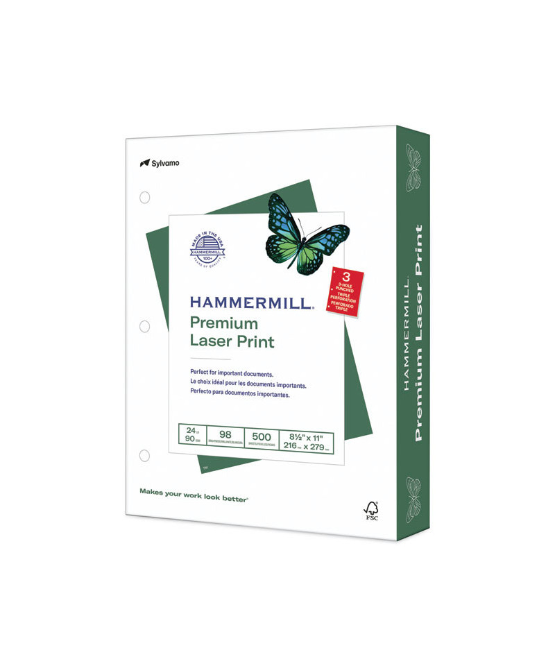 Premium Laser Print Paper, 98 Bright, 3-Hole, 24 lb Bond Weight, 8.5 x 11, White, 500/Ream