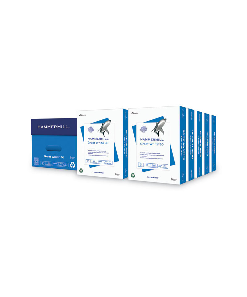 Versatile, 30% recycled printer paper makes hard work seem effortless. Great White® 30 is a dependable, everyday sheet that runs efficiently through all office equipment. making it ideal for copies, forms, faxes, memos, reports, price sheets, bulletins, legal briefs and more. Precise, accurate sheeting, consistent moisture content and curl control ensure smooth, trouble-free performance. Extremely smooth, it virtually eliminates paper jams and is backed by the 99.99% Jam-Free Guarantee. Acid-free material prevents yellowing over time to ensure a long-lasting appearance.