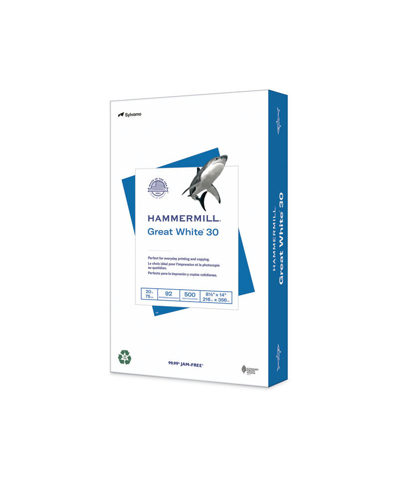 Versatile, 30% recycled printer paper makes hard work seem effortless. Great White® 30 is a dependable, everyday sheet that runs efficiently through all office equipment. making it ideal for copies, forms, faxes, memos, reports, price sheets, bulletins, legal briefs and more. Precise, accurate sheeting, consistent moisture content and curl control ensure smooth, trouble-free performance. Extremely smooth, it virtually eliminates paper jams and is backed by the 99.99% Jam-Free Guarantee. Acid-free material prevents yellowing over time to ensure a long-lasting appearance.