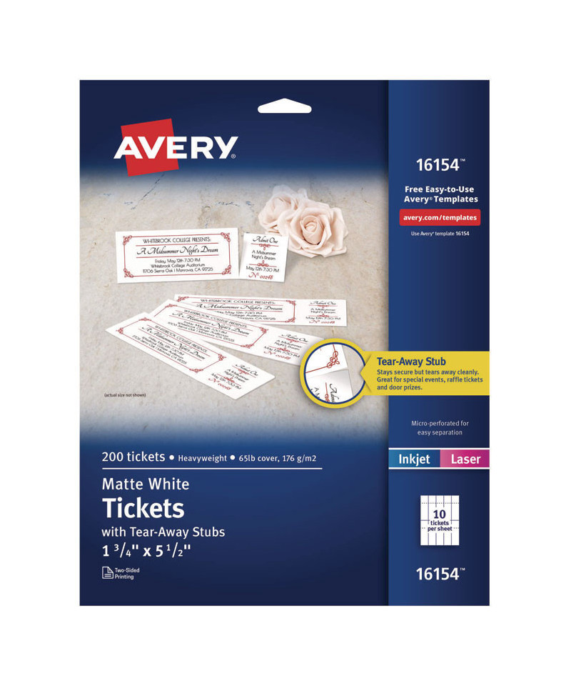 Create a buzz for your event or fundraiser by designing professional looking tickets from your own computer. These customizable Tickets with Tear-Away Stubs are easy to print and offer a professional look, making them perfect for raffles, door prizes, dances, school and church events or fundraisers. You can personalize your tickets on one or both sides at Avery® Design & Print with complimentary designs and templates, which include automatic ticket numbering options for easy record keeping. The tickets separate cleanly after printing with no scissors required. Strong perforations on the stubs ensure they will stay put until your event. Now you can create personalized tickets that will be the talk of any event. For laser and inkjet printers. Ten tickets per sheet. Card size is 1.75" x 5.5".