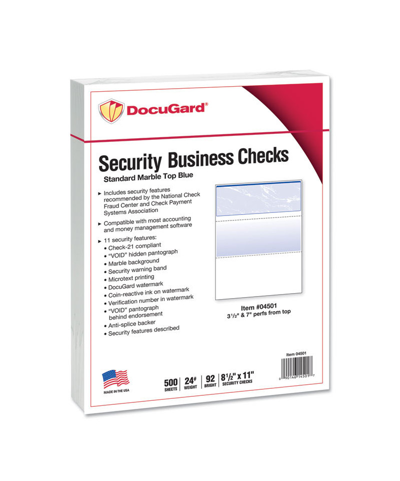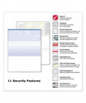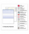 Incorporates security features recommended by the National Check Fraud Center. Compatible with most money management software programs. Security features include: Check-21 compliancy, "VOID" pantograph on the front and back, erasure-resistant background, security warning, anti-splice backer, security features listing, watermark, check verification number, patterned background and microtext print.
