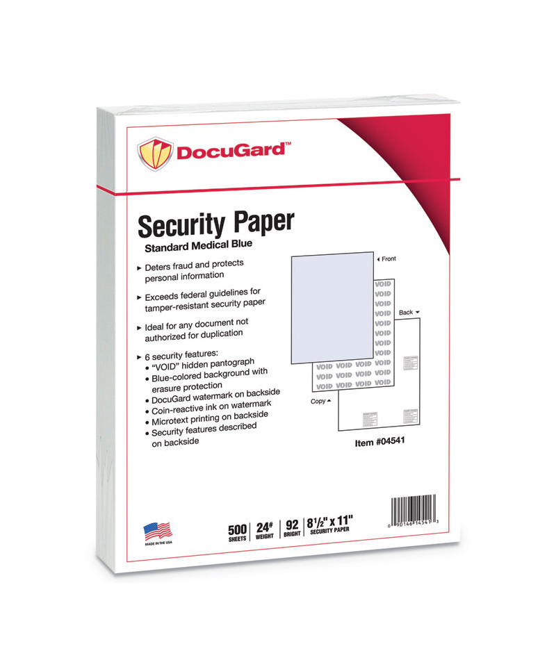 Prevent unauthorized copies and safeguard confidential business, legal, healthcare and personal documents. Designed to meet and exceed federal guidelines for tamper-resistant security paper set by the Centers for Medicare and Medicaid Services. Colored background with erasure protection. Artificial watermark is coin reactive.