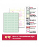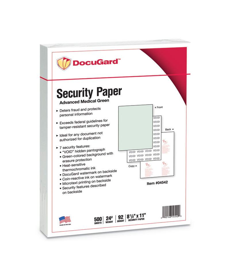 Prevent unauthorized copies and safeguard confidential business, legal, healthcare and personal documents. Designed to meet and exceed federal guidelines for tamper-resistant security paper set by the Centers for Medicare and Medicaid Services. Colored background with erasure protection. Artificial watermark is coin reactive.