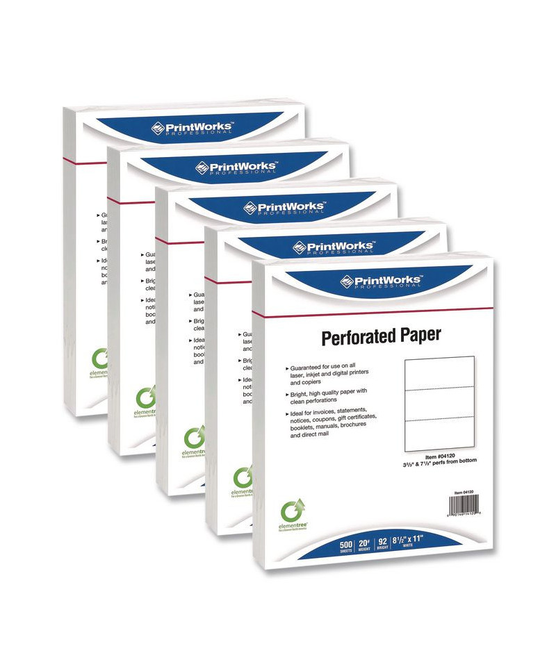 Perforated Paper, 3.66" and 7.33" from Bottom, 92 Bright, 20 lb Bond Weight, 8.5 x 11, White, 500/Ream, 5 Reams/Carton