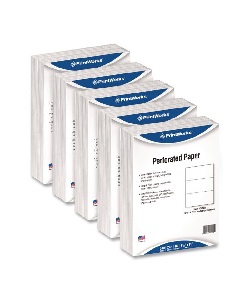 Perforated Paper, 3.66" and 7.33" from Bottom, 92 Bright, 24 lb Bond Weight, 8.5 x 11, White, 500/Ream, 5 Reams/Carton