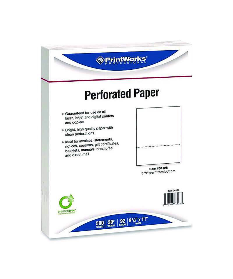 Print all your specialized documents with PrintWorks® Professional Perforated & Punched Paper. Whether perforated or punched, it's ideal for a variety of applications. Use perforated paper for invoices, statements, notices and any scenario where a user remittance might be required or choose pre-punched paper for use with ring binders, post binders or binding spines. High-quality, smooth surface sheets are guaranteed for use in all inkjet and laser machines.