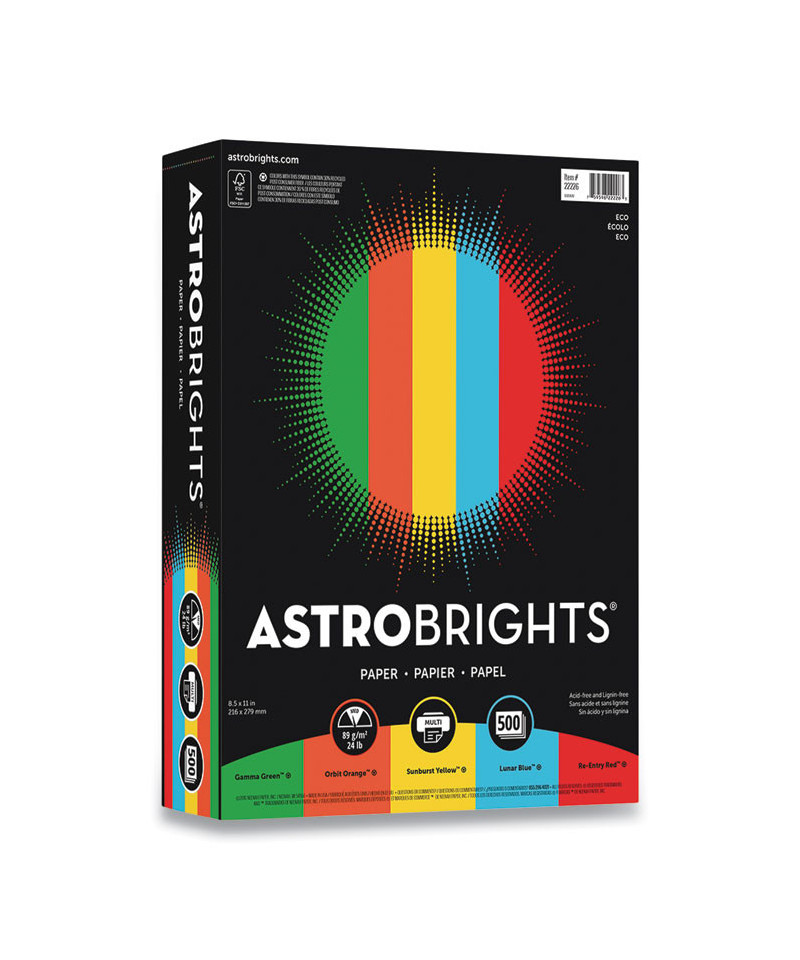 Bold colors get all the attention! When you need to stand out with high-impact colors, Astrobrights® Colored Paper is a brilliant choice. Brighter colors. Brighter ideas.™ Easily create vibrant presentations, fliers, brochures, school projects, signs, posters and more. As this paper is also more substantial, 20% thicker than ordinary paper, you can also achieve great results whether you're printing one- or two-sided documents. Plus, because the cosmic, universe-inspired color choices already create a vibrant, eye-catching background for your materials, you might even be able to save money by foregoing full-color printing.