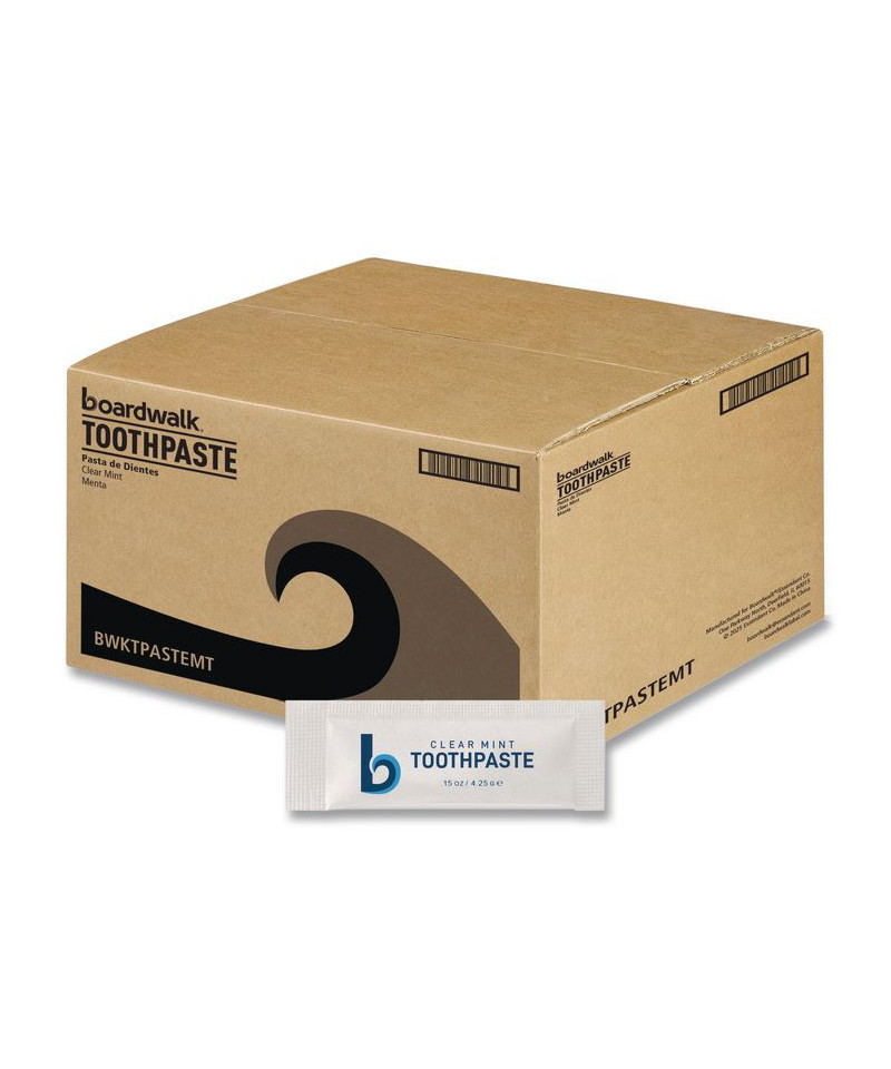 Protect smiles naturally with Boardwalk® Toothpaste, a formula that's gentle yet effective. Guests will experience a cleaner, fresher mouth with this fluoride-free toothpaste sachet packet. It is gentle enough for sensitive users, kids and anyone living a more natural lifestyle. Our non-abrasive whitening agents help remove surface stains to brighten smiles without harsh chemicals or gritty textures. Guests will enjoy a cool, minty finish that refreshes their breath without the lingering aftertaste of traditional toothpastes. Each single-use sachet is pre-portioned for mess-free convenience that is TSA-friendly, kid-approved and Mom-trusted. Ideal for hotels, health clubs, dental offices, hospitals, events, giveaways and hygiene or welcome kits. These compact sachets are space-saving, cutting down on bulky tubes and unnecessary waste. Boardwalk® Toothpaste is an EcoWell® Health and Wellbeing group product: 100% paraben and gluten-free, vegan, and 100% cruelty free; never tested on animals.