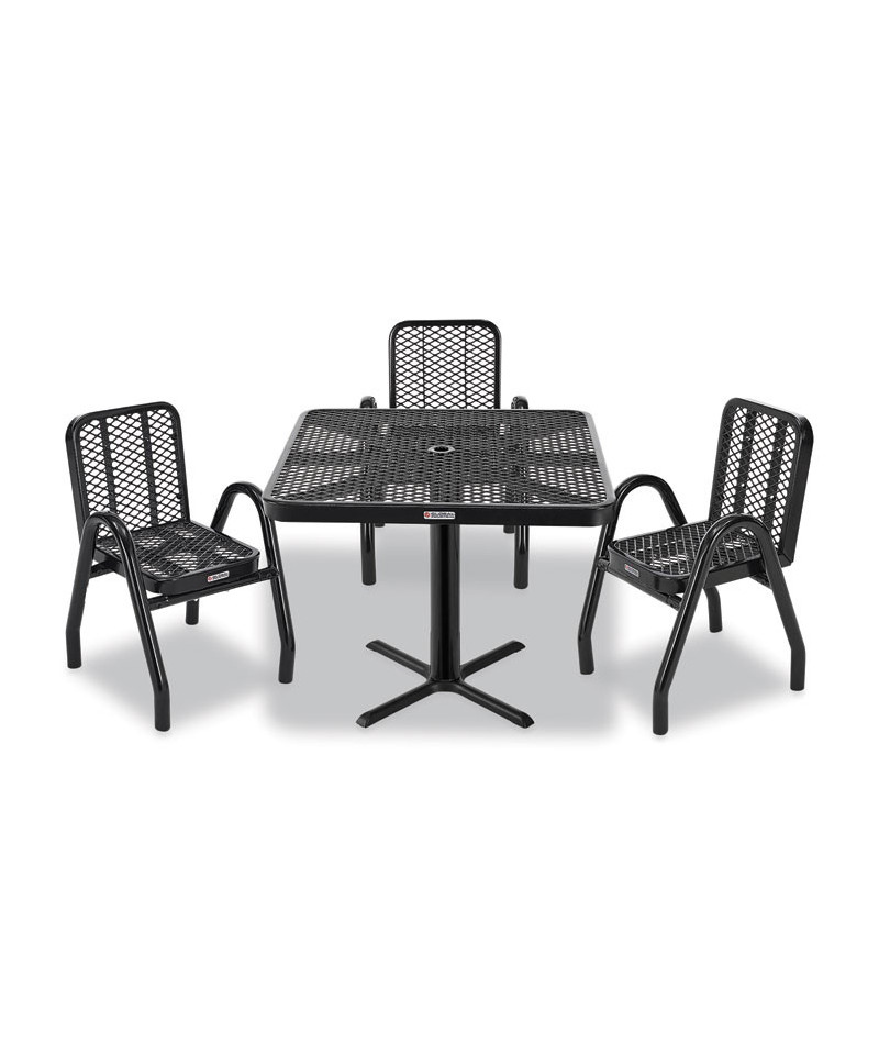 Provide unique style and comfortable outdoor dining for guests with this outdoor dining set. Ideal for restaurants, bars, outdoor food courts, public parks and streateries! Thermoplastic coating resists fading, mold and vandalism. High-gloss surface is designed to stay cool under the hot sun. 36" tabletop includes an opening to accept an umbrella with a pole of up to 1.5" diameter. The sturdy pedestal base features a black textured powder coat finish that resists corrosion. This table and chair set is easy to clean and will ensure maintenance-free durability through years of high-traffic usage. Easy assembly.