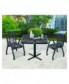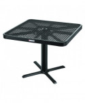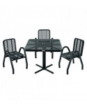Provide unique style and comfortable outdoor dining for guests with this outdoor dining set. Ideal for restaurants, bars, outdoor food courts, public parks and streateries! Thermoplastic coating resists fading, mold and vandalism. High-gloss surface is designed to stay cool under the hot sun. 36" tabletop includes an opening to accept an umbrella with a pole of up to 1.5" diameter. The sturdy pedestal base features a black textured powder coat finish that resists corrosion. This table and chair set is easy to clean and will ensure maintenance-free durability through years of high-traffic usage. Easy assembly.