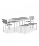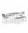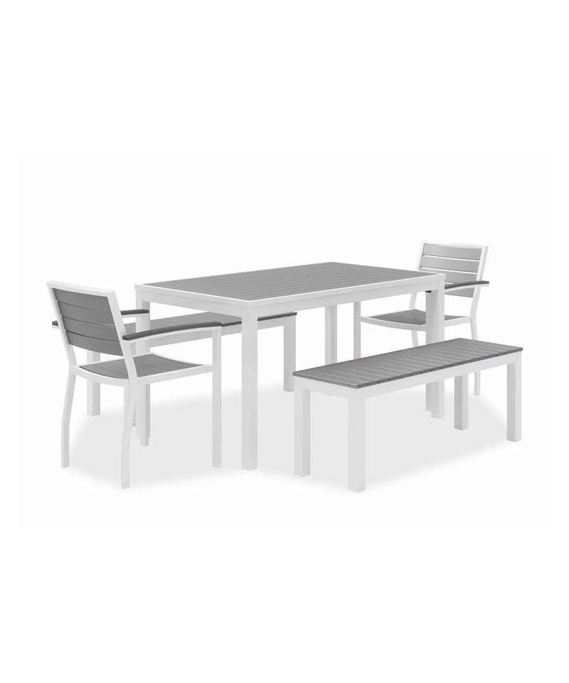 Stylish, stately and sturdy with an attractive, wonderfully practical design, Eveleen Outdoor Dining Table Sets have what you need to create a chic, comfortable space where you or your patrons can find a bit of outdoor respite. Featuring dent- and scratch-resistant, easy to clean "polywood" synthetic-polymer surfaces along with corrosion- and fade-resistant aluminum frames, the whole package is water-, mold- and temperature-resistant, fully primed to withstand the elements, making this set an ideal choice for outdoor use, whether you need to fully furnish your restaurant's patio or you simply need to find a suitable picnic-table alternative for your home's backyard. Set includes two matching, wide-format benches and two matching armchairs to achieve a tailored, cohesive look. which is perhaps everything you need to craft your ideal outdoor oasis. Chairs and benches ship fully assembled; table requires assembly.