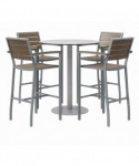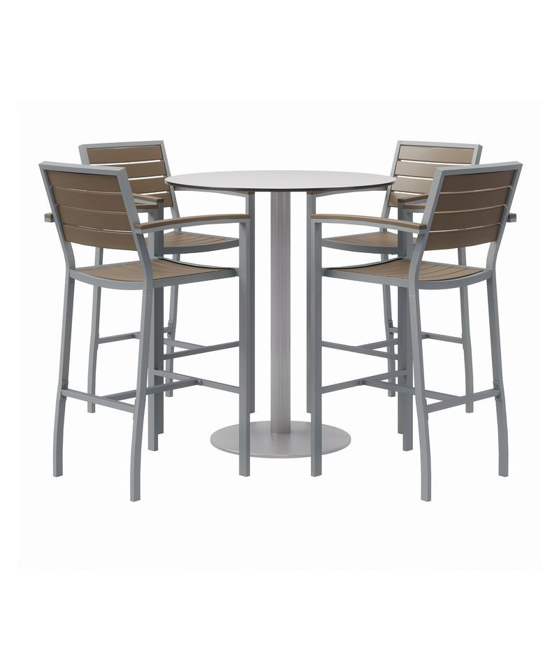 Eveleen Outdoor Bistro Patio Table with Four Mocha Powder-Coated Polymer Barstools, Round, 41"h, Gray