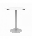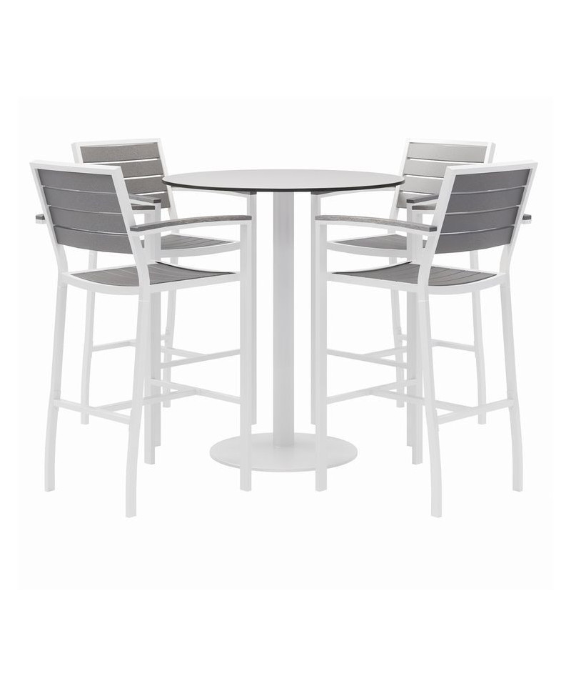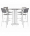 White 36" Round Phenolic Table Top, 41" Tall White Aluminum Table Base, (4) Gray Powder-Coated Polymer 29.5" Seat Height Barstools