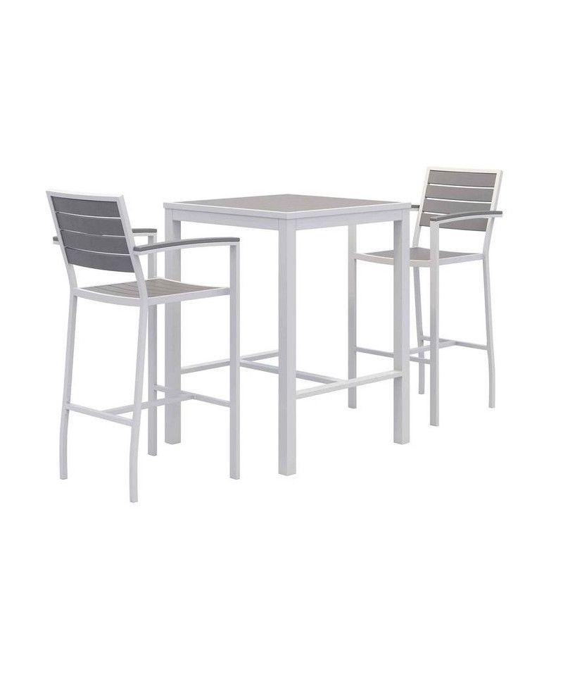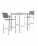Eveleen Outdoor Bistro Patio Table with Two Gray Powder-Coated Polymer Barstools, 30" Square, Gray