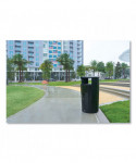 The Resist Round Waste Container is designed to maintain high-quality aesthetics under the most extreme outdoor conditions. Proprietary fan design resists up to 500 lbs of sustained blunt force. An advanced coating defends surfaces from graffiti and everyday stains. Special coating helps resist rust, corrosion and fading. The permanent rain hood prevents unwanted environmental debris from entering the container.
