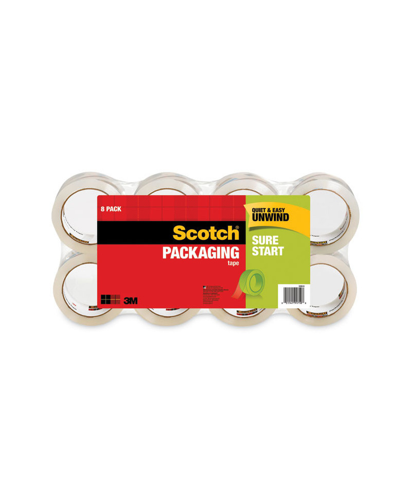 Scotch® Sure Start Packaging Tape features technology that allows a smooth, easy unwind. Seal your boxes with less noise when in a crowded office or a quiet cubicle setting. Sure Start means the tape unwinds smoothly, from start to finish, with no slivering or splitting for frustration-free taping. The tape's strong adhesive will keep even your heavy boxes sealed. For added utility, you can apply the crystal clear tape over shipping labels for greater shipping security.