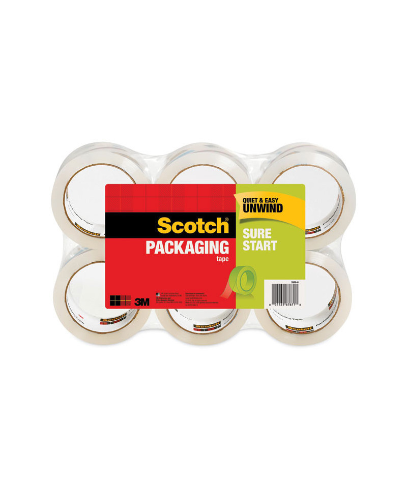 Scotch® Sure Start Packaging Tape features technology that allows a smooth, easy unwind. Seal your boxes with less noise when in a crowded office or a quiet cubicle setting. Sure Start means the tape unwinds smoothly, from start to finish, with no slivering or splitting for frustration-free taping. The tape's strong adhesive will keep even your heavy boxes sealed. For added utility, you can apply the crystal clear tape over shipping labels for greater shipping security.