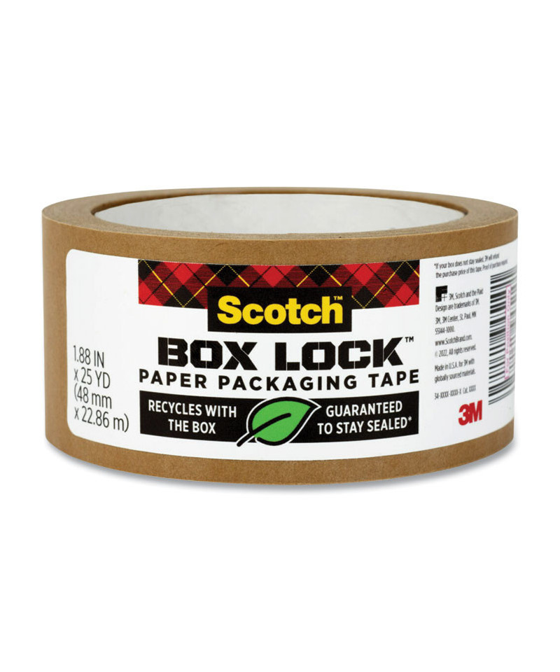 Scotch® Box Lock™ Paper Packaging Tape is tear by hand and guaranteed to stay sealed. Provides an extreme grip for a confident seal. Holds up to 80 pounds and won't come undone while on the move. If your box does not stay sealed, 3M will refund the purchase price of this tape. Proof of purchase required. Contact: 1-800-3MHELPS. This tape can be easily recycled with the box, no need to remove upon opening your package. Just one strip, it ships. Provides durable holding power, you don't need multiple layers of tape to get a strong, secure seal you can trust to hold together. Sticks instantly to any box, even harder-to-stick-to 100% recycled boxes, no water or scissors needed. No plastic shrink wrap used, made with 45% bio-based material.